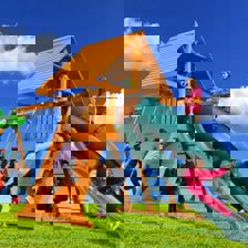 The Supreme is the next size up from the Supremescape, and the most popular of the Angled-Base swing sets. It has a wider footprint and a bigger clubhouse with more standing room. This playset also features the most activities of all our single clubhouse units. Comes complete as pictures with all accessories.